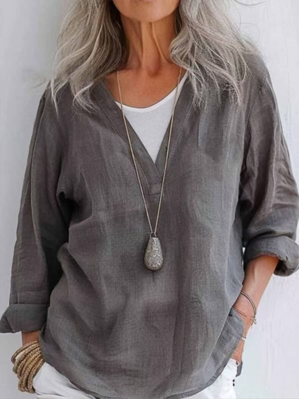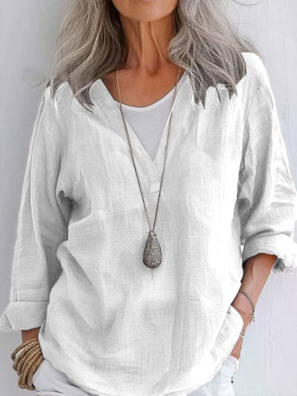 Ladies Cotton Linen Round Collar Loose Casual Shirt