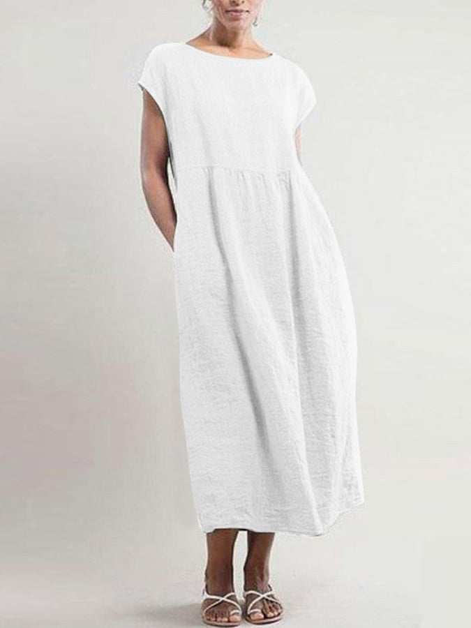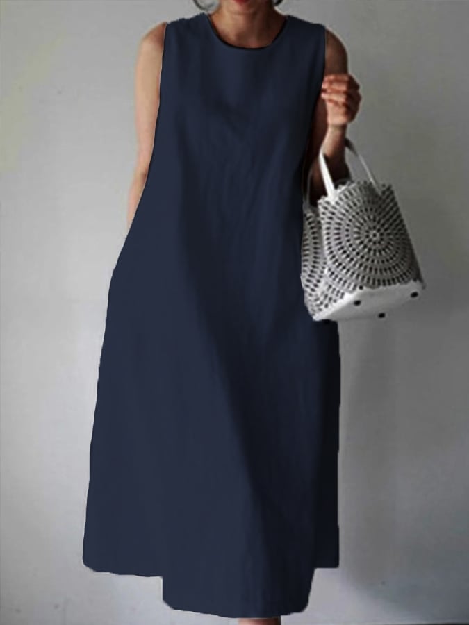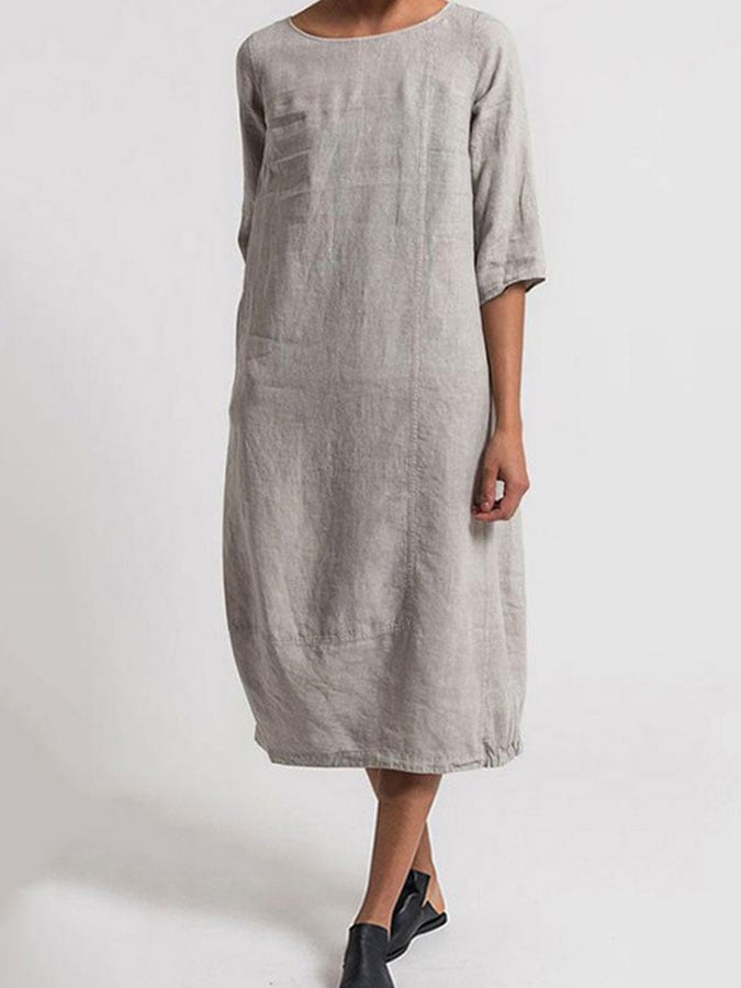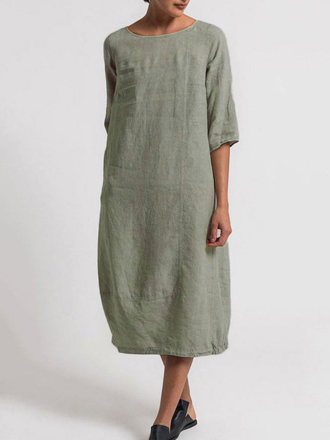 Ladies Cotton Linen Round Neck Long Sleeve Dress