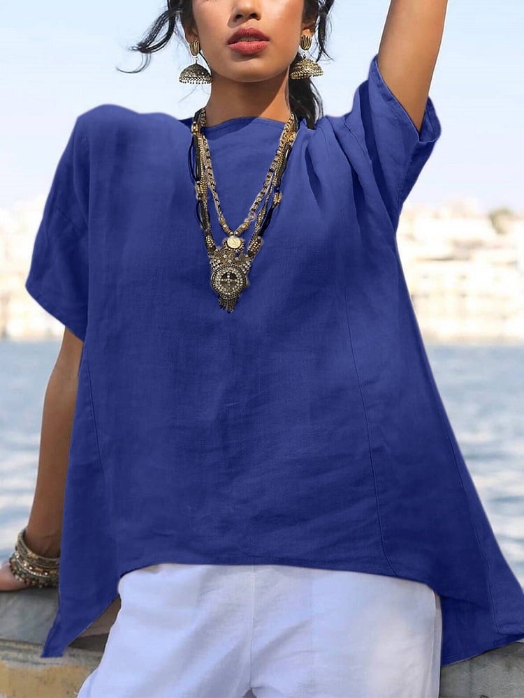 Ladies Cotton Linen Irregular Hem Panel Casual Short Sleeve Shirt