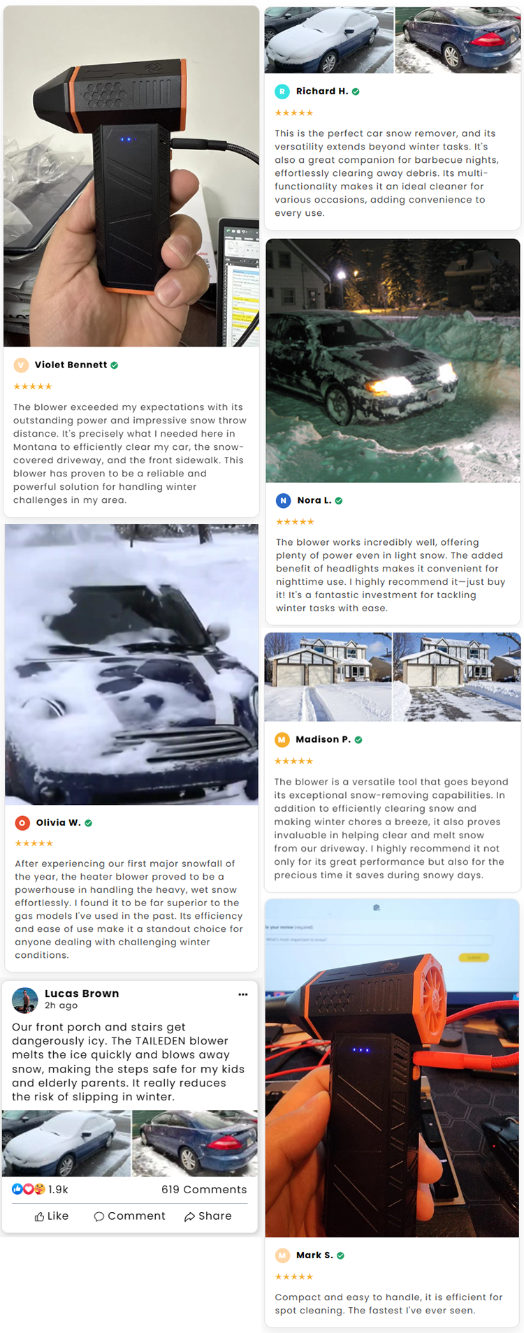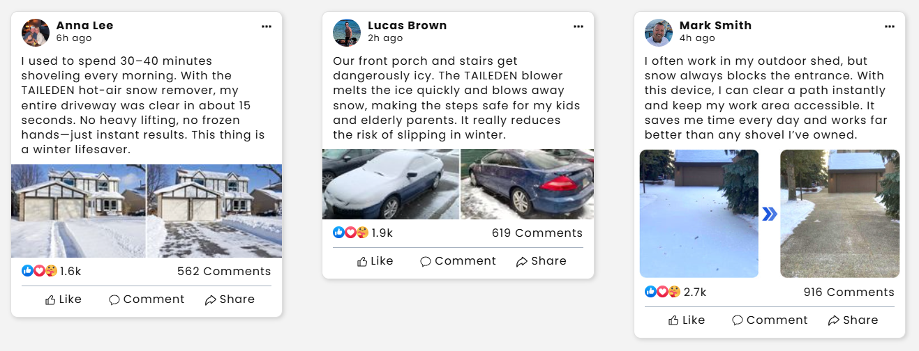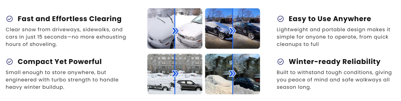 The TAILEDEN 12000W snow remover, equipped with a high-torque brushless motor and powerful high-temperature airflow, can instantly break down ice and blow away heavy snow. In just15 seconds, you can free yourself from the frustration of endlesss hoveling and hard scraping. Whether you're heading out towork, clearing outdoor pathways, or creating a safe entrance for your family, TAILEDEN helps you handle winter snow more quickly,more easily, and more safely. Spend less time locked in a battle with snow and ice, and save your time and energy for the things that truly matter.