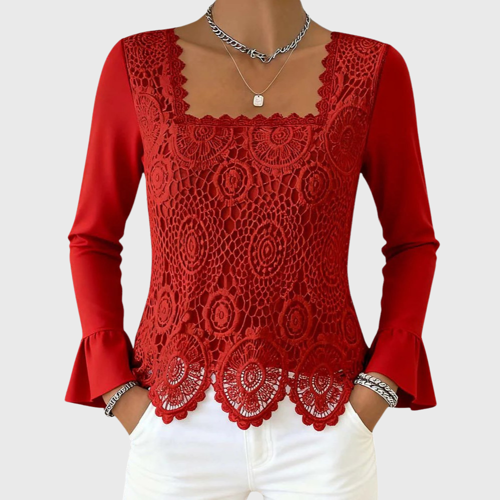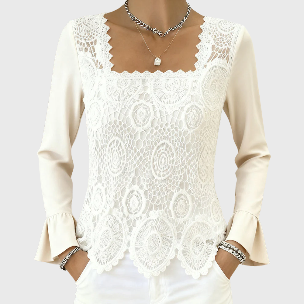 Square neckline that frames the face beautifully and pairs perfectly with layered jewelry.