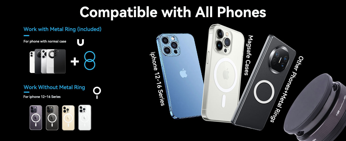 Wide Compatibility Across Devices: Works seamlessly with Magsafe-enabled iPhones (no extra rings needed) and "Other Phones & Cases"—just attach the included "sticky magnetic ring" for non-Magsafe devices. The design explicitly supports "Regular Cases" and various phone models, ensuring universal adaptability.