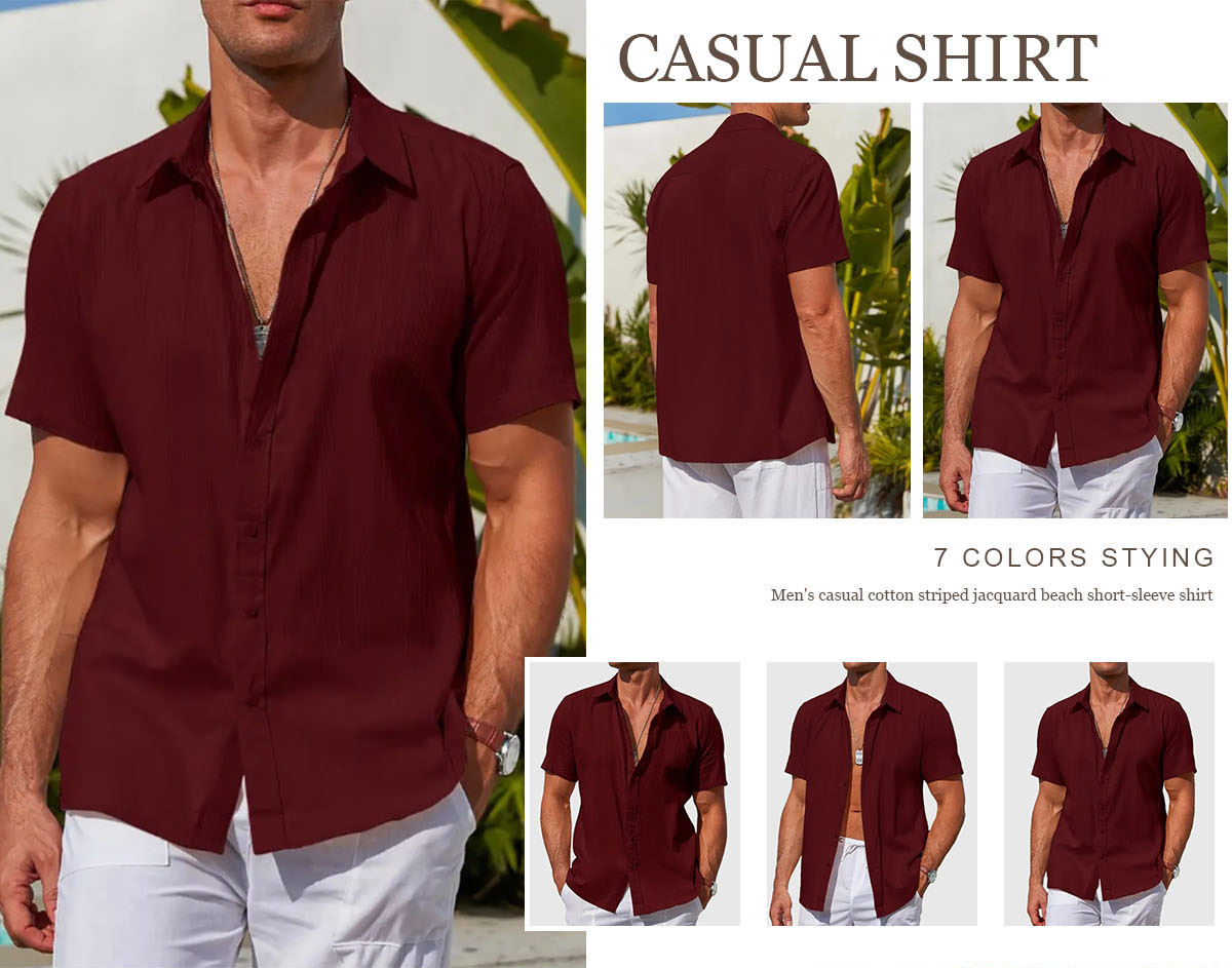 Men's casual cotton striped jacquard beach short-sleeve shirt