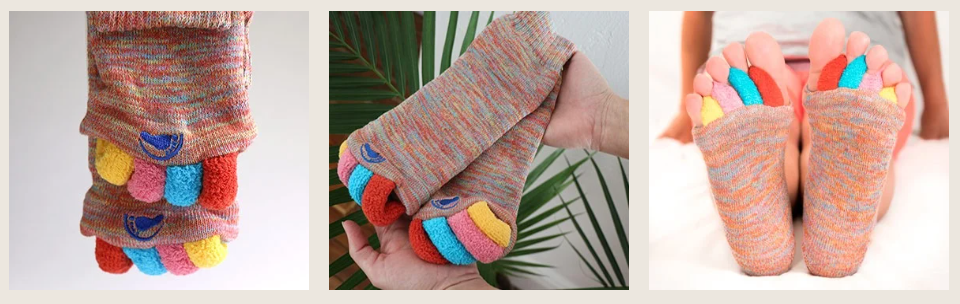 My Pleasant Feet Socks are made from soft cotton, polyester, and spandex and feature a patented design that uses an innovative "toe separator" to gently stretch the toes, thereby improving toe strength and flexibility.