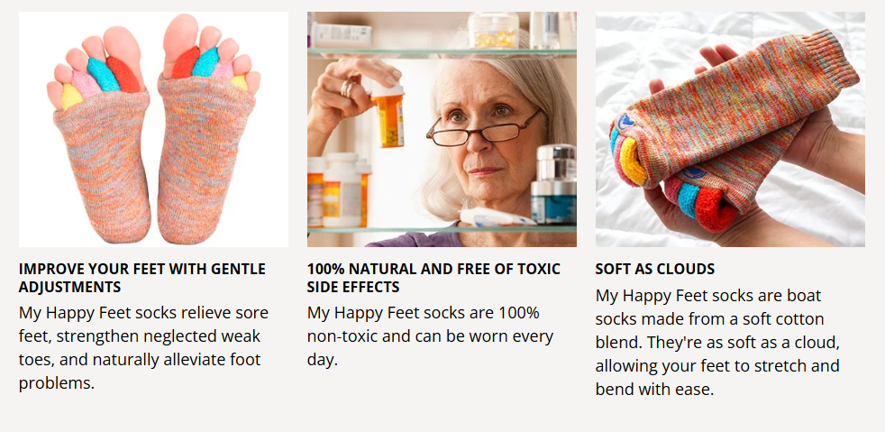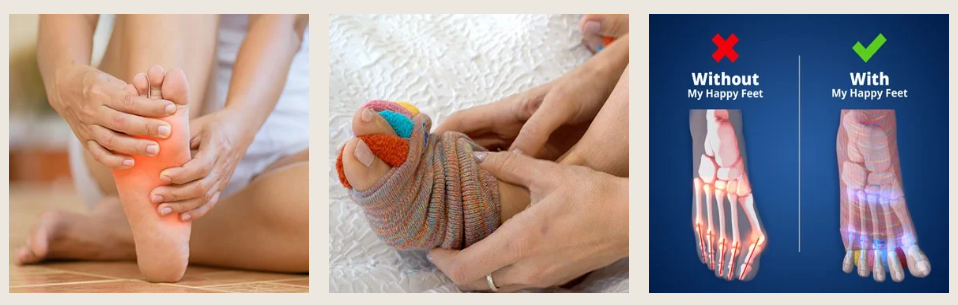 My Happy Feet Socks quickly relieve all types of foot pain by gradually adjusting the position of the toes, reducing the harmful effects of daily foot pressure.