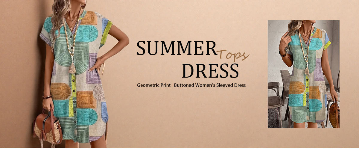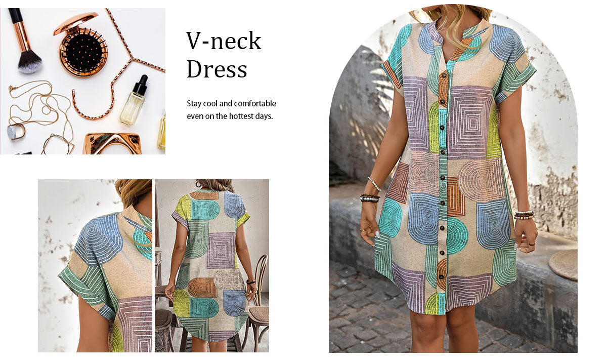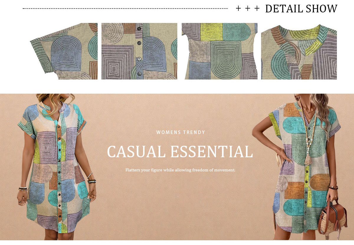 Summer Geometric Print Elegant V-neck Buttoned Women's Short-sleeved Dress