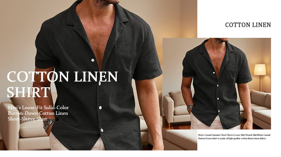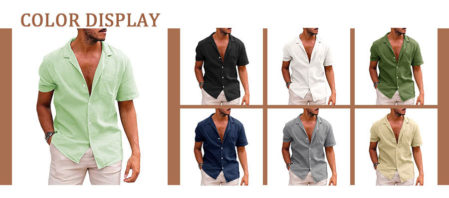Men's Casual Summer Short Sleeve Loose Shirt Beach ShirtMens Casual Button Down shirt is made of high quality cotton linen Linen fabric.BreathableLightweight, Skin-friendly, which can resistant shrink, provide you feeling cool and comfotable all dayMens beach shirts features short sleeve, spread collar, button closure, chest pocket, relaxed fit.Thevneck makes this shirt more stylish and simple.
