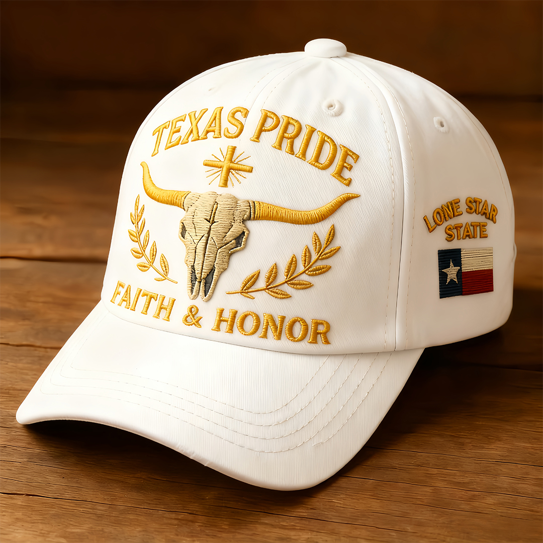 Feiern Sie den unerschütterlichen Geist des Lone Star State mit dieser Texas Pride Heritage Cap. Mit mutigen Details bestickt, zeigt sie den Longhorn-Schädel – ein Symbol für Widerstandsfähigkeit und Stärke – umrahmt von Lorbeerzweigen der Ehre und den kraftvollen Worten Faith & Honor. An der Seite erklärt das Patch der Lone Star Flagge stolz Lone Star State, ein zeitloses Emblem der texanischen Identität.